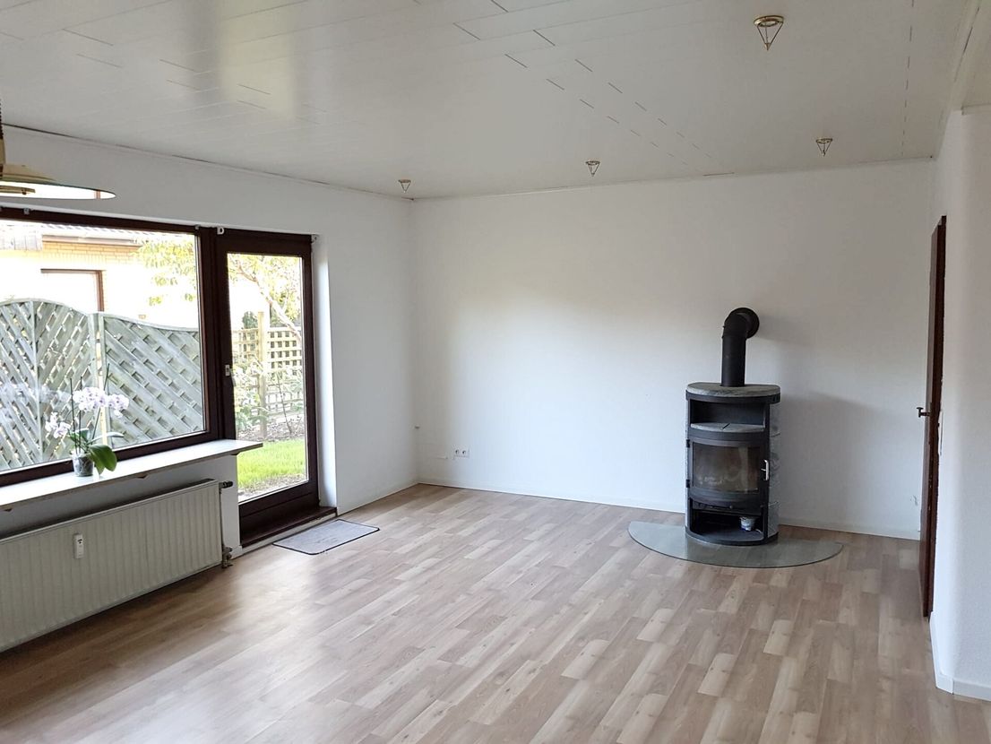 Die Erdgeschosswohnung bietet fünf Zimmer, bestehend aus Wohnzimmer, Elternschlafzimmer, Kinderzimmer, Arbeitszimmer sowie einem weiteren Zimmer (Anbau), eine Küche, ein Badezimmer und ein Gäste-WC. Ein Kamin sorgt hier für eine angenehme Wohnatmosphäre.